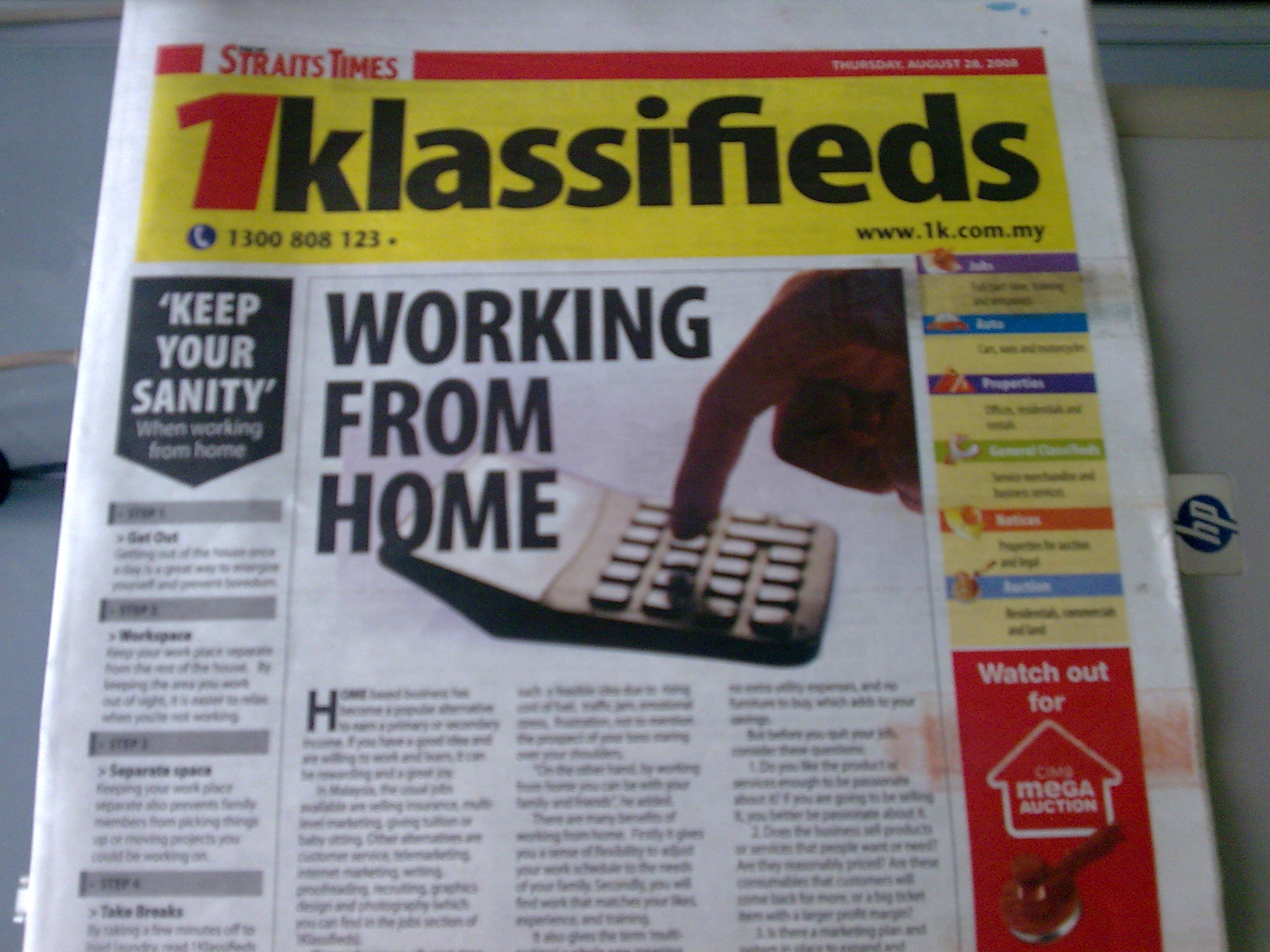 While having my coffee break this morning I grabbed a copy of New Straits Times (NST). The front page is about How Anti Corruption Agency (ACA) nabs 28 Puspakom Officers and 19 runners. They we all arrested on suspicion of accepting bribes. Then I flip to the classified page and here is the title that interest me, “Working From Home”. In case that you did not have a chance to read about this, I will share the summary here.