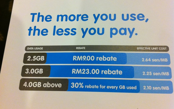 At the official launch November 19, YTL’s Yes 4G WiMAX service unveiled the prices with prices starting at 2.64 sen per MB for data usage totalling 2.5GB and below. The prices vary according to usage, where the more you use, the cheaper the rate per MB. At 3GB, the rate is 2.25 sen per MB and at 4GB or more, it comes to 2.10 sen.