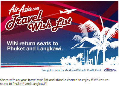 AirAsia has tapped into social networking site Facebook to reach potential customers. The Travel Wish List application gives Facebookers a chance to win free return seats to Phuket (Thailand) and Langkawi. Guys, why not plan this for the coming year end holiday for the free return flights. At least at this current economy downturn we could go for a budget holiday with AirAsia. 🙂 (my advise is no need to go to overseas, Langkawi will do!)
